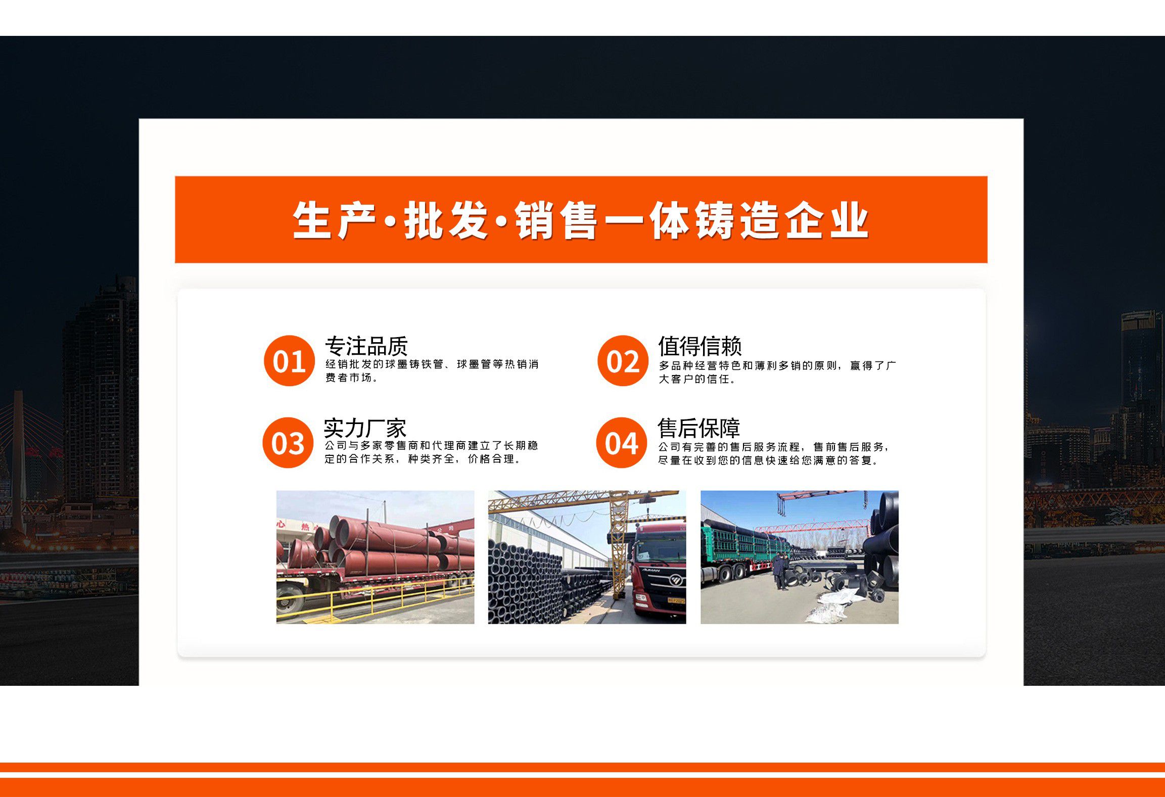 青島金源達(dá)管業(yè)有限公司主要經(jīng)營(yíng)各種規(guī)格球墨鑄鐵管,球墨管,球墨鑄鐵管廠家等產(chǎn)品,質(zhì)量可靠,誠(chéng)信經(jīng)營(yíng),值得信賴! 青島金源達(dá)管業(yè)有限公司始終堅(jiān)持“誠(chéng)信立業(yè),追求卓越,合作共贏,共同發(fā)展”,竭誠(chéng)歡迎各界朋友來廠參觀指導(dǎo),洽談業(yè)務(wù)。我們?cè)概c您攜手共進(jìn),互惠雙贏,共創(chuàng)未來! 公司堅(jiān)持“以奮斗者為本”的理念,關(guān)心關(guān)愛職工,職工的獲得感、幸福感更加充實(shí)、更有保障、更可持續(xù);秉承“忠誠(chéng)企業(yè)、勇于擔(dān)當(dāng)、開拓創(chuàng)新、主動(dòng)作為”,堅(jiān)持黨建領(lǐng)航、創(chuàng)新驅(qū)動(dòng)、文化塑魂、奉獻(xiàn)社會(huì),全面致力于綠色、低碳、高效、高質(zhì)量發(fā)展?! ≡概c各界朋友攜手并進(jìn),共創(chuàng)未來!...